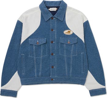 Grid-patterned abraded denim adds a structured edge to the retro colorblocked design of this trucker jacket finished with a signature logo patch at the chest.