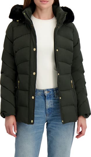 Gleaming hardware and a removable hood trimmed in faux fur are just two of the details that will make this puffer your go-to option for chilly days.