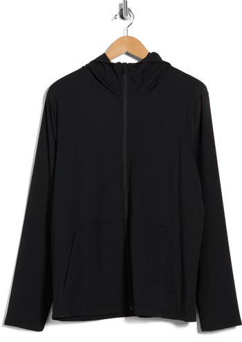 A lightweight layering piece for workouts and cool downs, this full-zip hoodie is cut from a soft nylon blend with plenty of stretch.