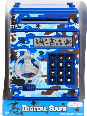 Coin, cash and small treasures are safely locked in a password protected safe that looks cool on your kiddos room.