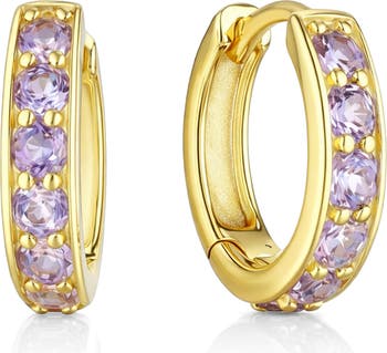 Channel-set amethyst adds vibrant sparkle to these huggie hoop earrings plated in gleaming 14-karat gold.