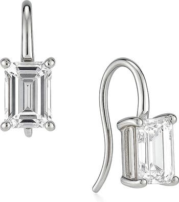 Emerald-cut moissanite adds brilliant sparkle to these eye-catching drop earrings plated in bright 14-karat gold.