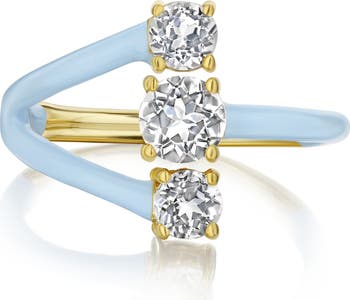 A trio of round-cut stones and colorful enamel finish deliver a playful update to a faux-stack ring finessed with gleaming 14-karat gold plate prongs.