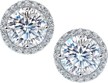 Pavé and round-cut moissanite add brilliant sparkle to these eye-catching stud earrings plated in bright 14-karat gold.