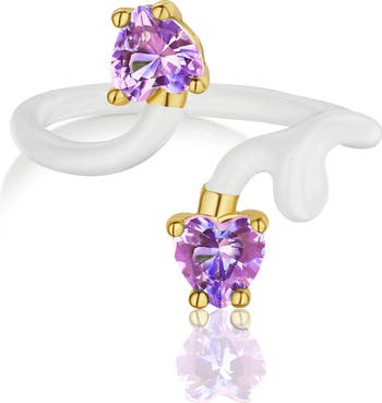 Add a unique touch to your ensemble with this bypass-style ring coated with white enamel along the band and anchored by a duo of heart-shaped amethyst stones.
