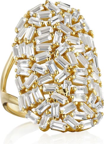 Refine your evening ensembles with this oval ring showcasing baguette-cut white topazes and plated in 14-karat gold.