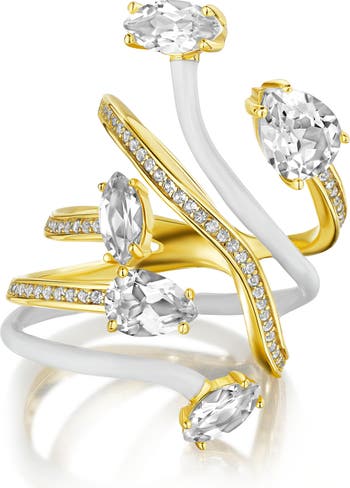 Marquise- and pear-cut white topaz adds radiant sparkle to this two-tone vine ring with added pavé sparkle.