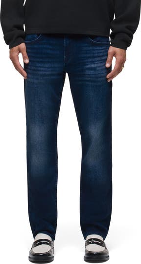 Stretchy denim in a dark indigo wash gets a lived-in look from subtle fading at the puckers and wear points of these straight-leg jeans.
