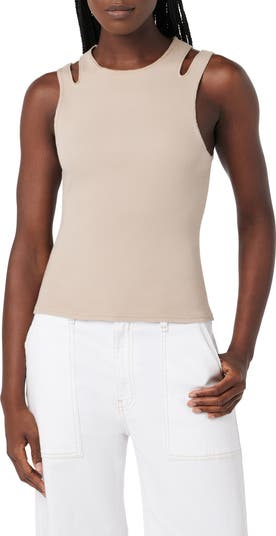 Perfect for layering and easy to wear alone, this ribbed tank feature edgy cutouts at the shoulder.