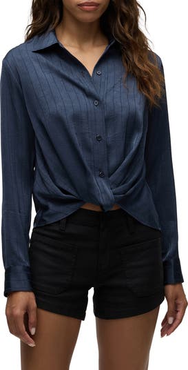 A knotted front adds a touch of playful charm to this button-down shirt cut from softly crinkled fabric.