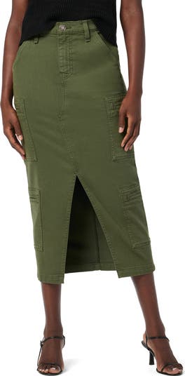 A kicky front slit brings effortless movement to this stretch-kissed denim midi skirt finished with cargo pockets.
