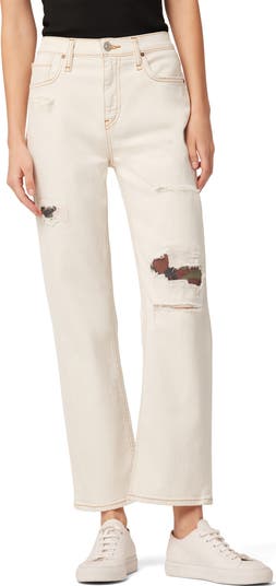 Camo print patterns peek out from distressed details set int straight leg jeans that feature a trendy ankle length.