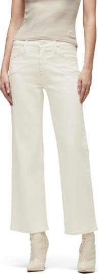 A wavy yoke and an ecru wash bring Western-inspired style to these ankle-length wide-leg jeans made from soft stretch denim.