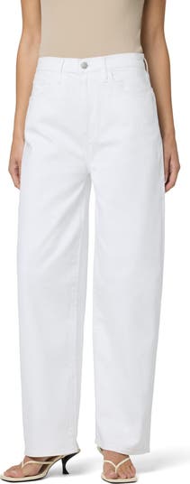 Made from bright-white stretch denim, these trendy barrel jeans feature a superhigh waist and curved legs that taper to the hems.