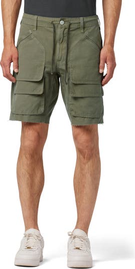 A raw hem and washed finish create a worn-in effect on drawstring waist cargo shorts that feature exterior placed pockets.