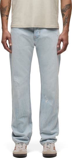 These jeans are cut from a faded-indigo nonstretch denim with signs of wear and abrasions that give them a well-loved broken-in look and feel the very first time you wear them.