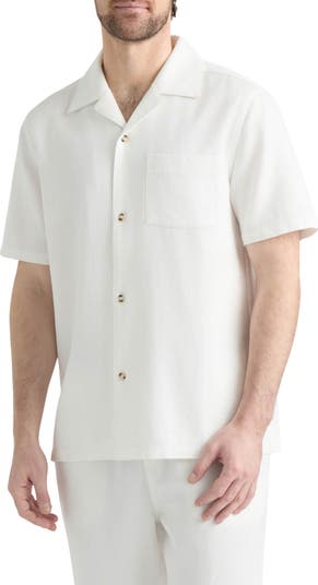 A relaxed silhouette creates an easygoing vibe in a button-up shirt framed by short sleeves and a notched collar.