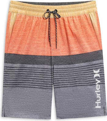 An all-over striped ombré pattern adds a cool and casual style to these board shorts with a secure drawstring waist.