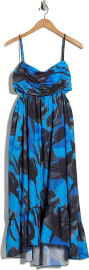 Side cutouts enhance the breezy charm of this cotton maxi dress fashioned with a ruched bodice, Empire waist and flounced high-low hem.