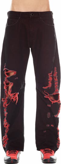 Red distressing authenticates these edgy denim jeans cut in a baggy fit.