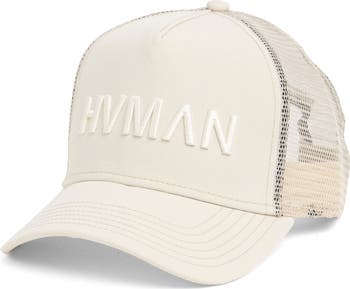 HVMAN logo embroidery details the front of a trucker cap that features mesh panels and an adjustable back closure.