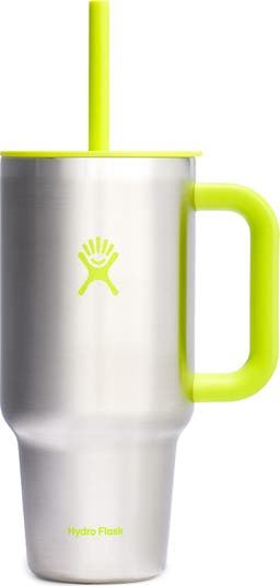 Stay hydrated on the go with this large, 32-ounce insulated travel tumbler with double-wall TempShield™ construction that keeps drinks cold for up to 24 hours. The durable design features an ergonomic handle, a flexible straw and a splash-resistant Press-In Straw Lid for easy sipping. The sweat-free exterior features a cool brushed finish and is comfortable to the touch.