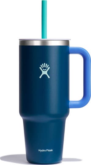 Stay hydrated on the go with this large, 40-ounce insulated travel tumbler that keeps drinks cold for up to 24 hours. The durable design features an ergonomic handle, a flexible straw and a splash-resistant Press-In Straw Lid for easy sipping. The sweat-free Color Last™ powder coating is colorful and comfortable to the touch.