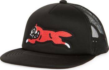 An embroidered Running Dog is stuck in place on the front of a trucker cap made with a breezy mesh back and finished with a snapback strap.