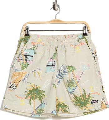 Tropical graphics bring vacation-ready appeal to nylon shorts outfitted with handy pockets.