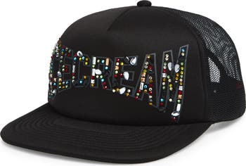 This laid-back trucker hat features a bold brand graphic with colorful rhinestone detailing and breathable mesh panels to keep you cool and shaded.