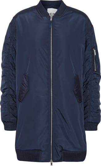 Cocoon yourself in this cozy longline bomber jacket framed by a sporty two-way zip closure and ruched sleeves.
