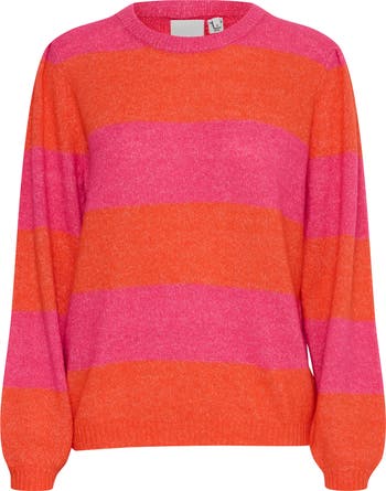 Give your casual look a colorful updated with this cozy, oversize sweater that features a block of colorful stripes over the waist and sleeves.