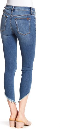 An angled frayed hem creates the on-trend look of these skinny jeans. Fit: this style fits true to size. Sizing: 24=00, 25=0, 26=2, 27=4, 28=6, 29=8, 30=10, 31=10-12, 32=12 - Zip fly with button closure - 5 pocket construction - Fading and whiskering - Angled frayed hem - Approx. 9" rise, 27" inseam (size 26) - Imported