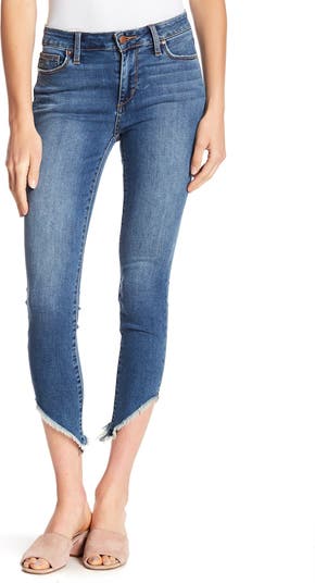 An angled frayed hem creates the on-trend look of these skinny jeans. Fit: this style fits true to size. Sizing: 24=00, 25=0, 26=2, 27=4, 28=6, 29=8, 30=10, 31=10-12, 32=12 - Zip fly with button closure - 5 pocket construction - Fading and whiskering - Angled frayed hem - Approx. 9" rise, 27" inseam (size 26) - Imported