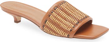 A woven texture defines the wide vamp strap atop a resort-ready sandal lofted by an of-the-moment kitten heel.