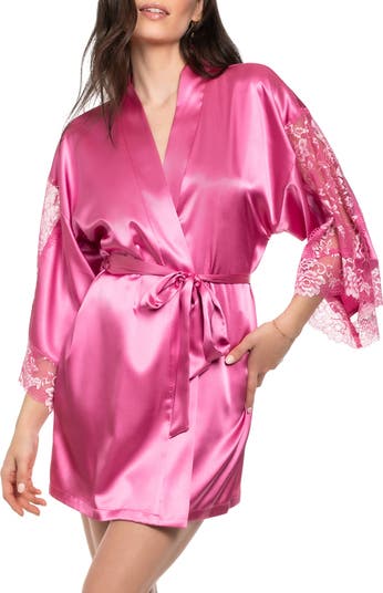 Bring an air of luxury to your evening routine in this stretchy satin wrap with sheer, floral-lace insets at the sleeves.