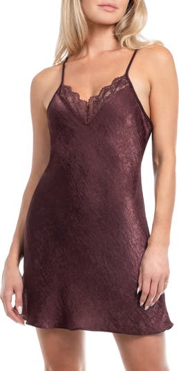 Scalloped lace sweetly trims the neckline of an alluring satin chemise designed to bring a little flair to your bedtime routine.