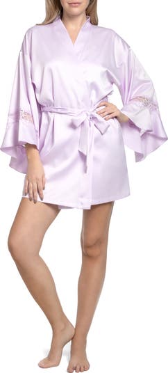 Perfect for any occasion, this romantic wrap robe is constructed from smooth satin with floral lace trim, wide sleeves and a removable tie.