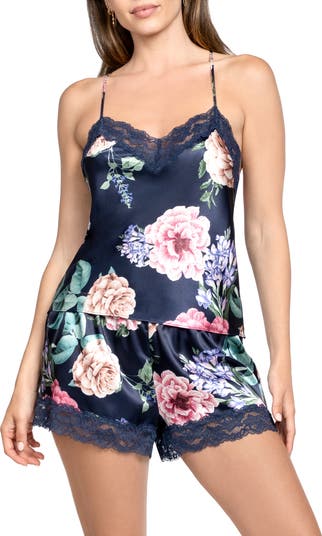 Drifting off to dreamland is much more romantic in the winsome charm of these satin camisole PJs finished with scalloped lace trim.