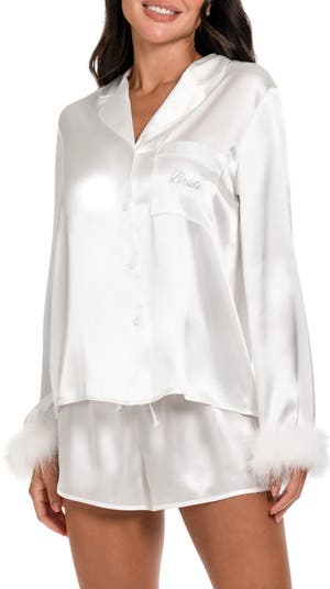 Soft feathers trim these Bride-to-be pajamas made from smooth satin with a long-sleeve top and matching shorts.