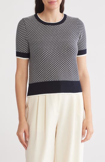 A chic honeycomb pattern enlivens the look of this short-sleeve sweater knit from soft cotton-blend yarns.