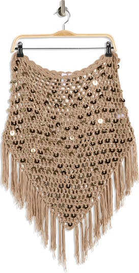 Take any look to the next level with the sparkle and shine of this fringed, open-knit poncho covered in tonal sequins.