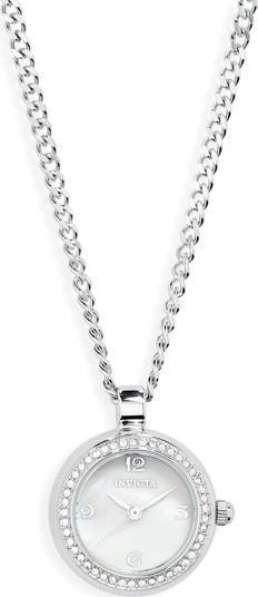 A sparkly crystal bezel adds a glamorous touch to this dainty watch pendant necklace featuring a mother-of-pearl dial with precise three-hand movement.