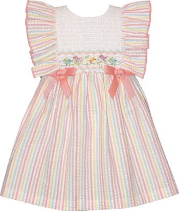 A classic flared skirt sets the scene for twirls in this seersucker-stripe dress, finished with embroidered birds and graceful satin ribbons for a touch of whimsy.