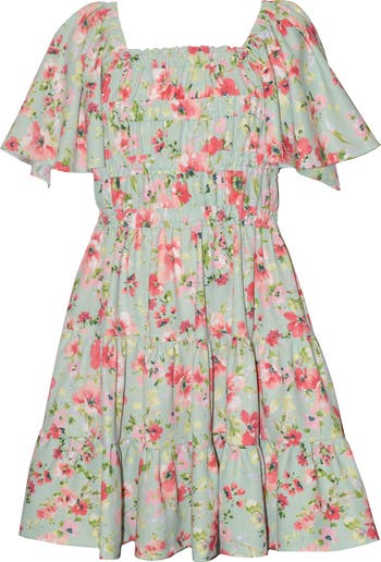 Frilly angelic sleeves and an open back finished a bow accent elevate this floral dress made for kid-approved days in the sun.