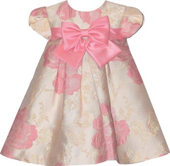 A darling bow adds to the sweetness of a petal-sleeve party dress that's covered in jacquard blooms illuminated by metallic threads.