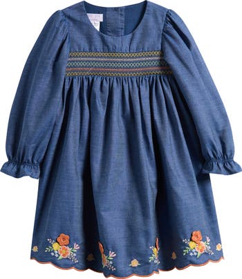Vibrant floral embroidery and smocked accents add free-spirited flair to this long-sleeve denim dress your little one is sure to love.