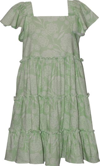 A tiered skirt has your kiddo prancing in a patterned dress made from a lightweight jersey with graceful flutter sleeves for a whimsy finish.
