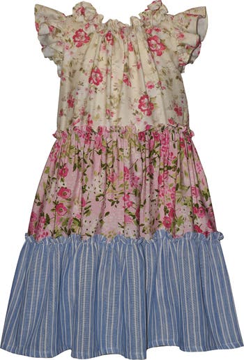 A tiered skirt sets the scene for twirls in this patchwork dress, finished with graceful flutter sleeves for a touch of whimsy.