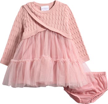 A cable-stitched crossover bodice sweetens this tiered mesh dress complete with coordinating bloomers to give baby a complete look.